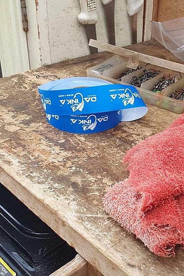 After placing the bait on the hook, tear off the appropriate length of tape (about 10-12cm). Lick one end of the tape and stick it to the outside of DaCinka leaving a little bit to fold over the inside of the curved tail.